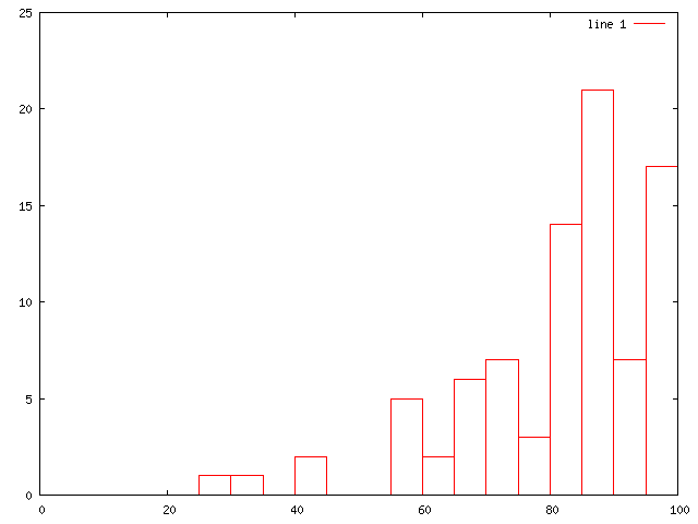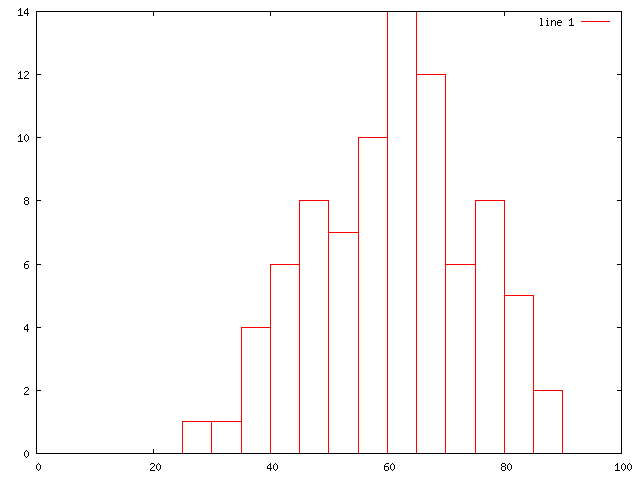 中間試験に比べたら難しかったようで, 平均点は中間試験に比べて大きく下った. 中間試験に比べて難易度が増して, 出題範囲も広くなっているからだろう. 得点分布は, キレイな分布になっている.